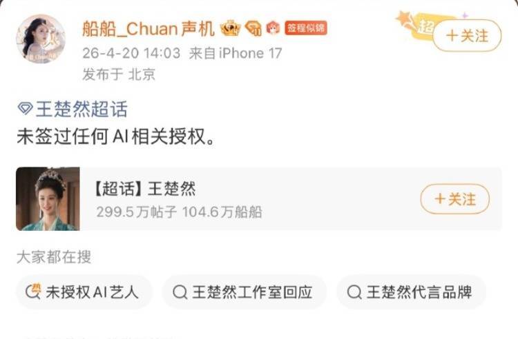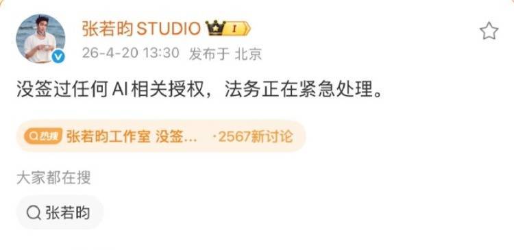 当天下午,张若昀工作室率先发布严正声明,称“没签过任何AI相关授权,法务正在紧急处理”。紧接着,于和伟工作室、王楚然后援会官方账号、李一桐方面等接连发声,均明确表示“未签署任何AI相关授权”。