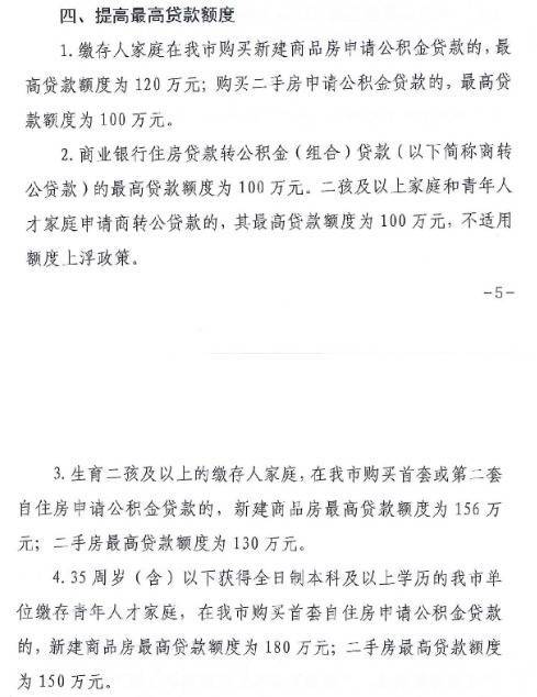 生育二孩及以上的缴存人家庭购买首套或第二套自住房,最高贷款额度可在现行标准基础上提高30%,新房最高贷款额度156万元,二手房最高贷款额度130万元。