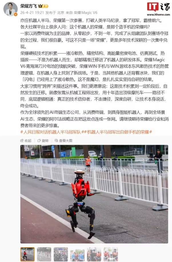 4 月 19 日,2026 北京亦庄人形机器人半程马拉松正式落幕,荣耀齐天大圣队自研的人形机器人“闪电”以 50 分 26 秒的净用时拿下赛事冠军,成为手机终端厂商中首个在该赛事夺冠的品牌。